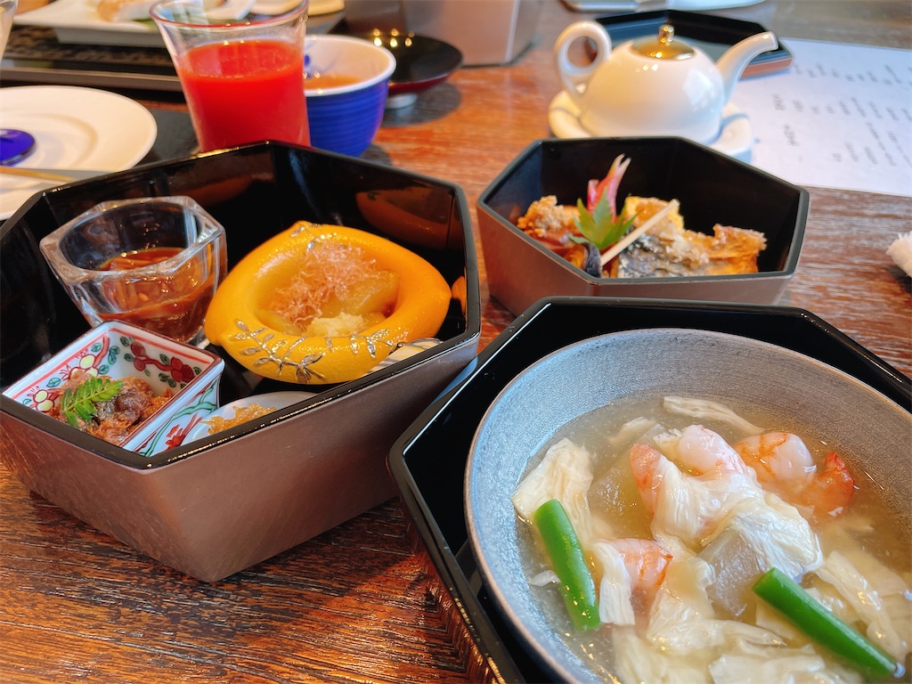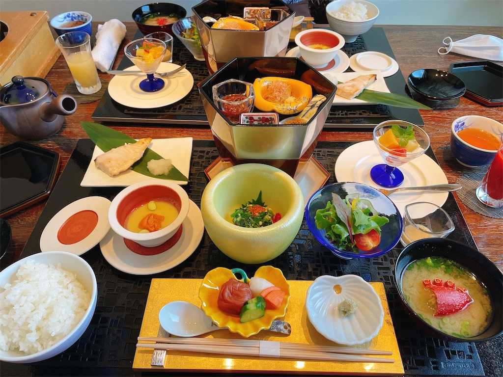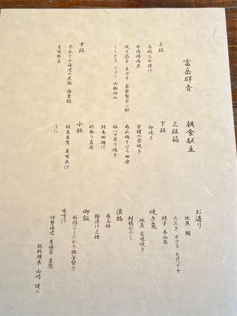 朝食はお食事会場でいただきました。お品書きとお料理🍚🥢